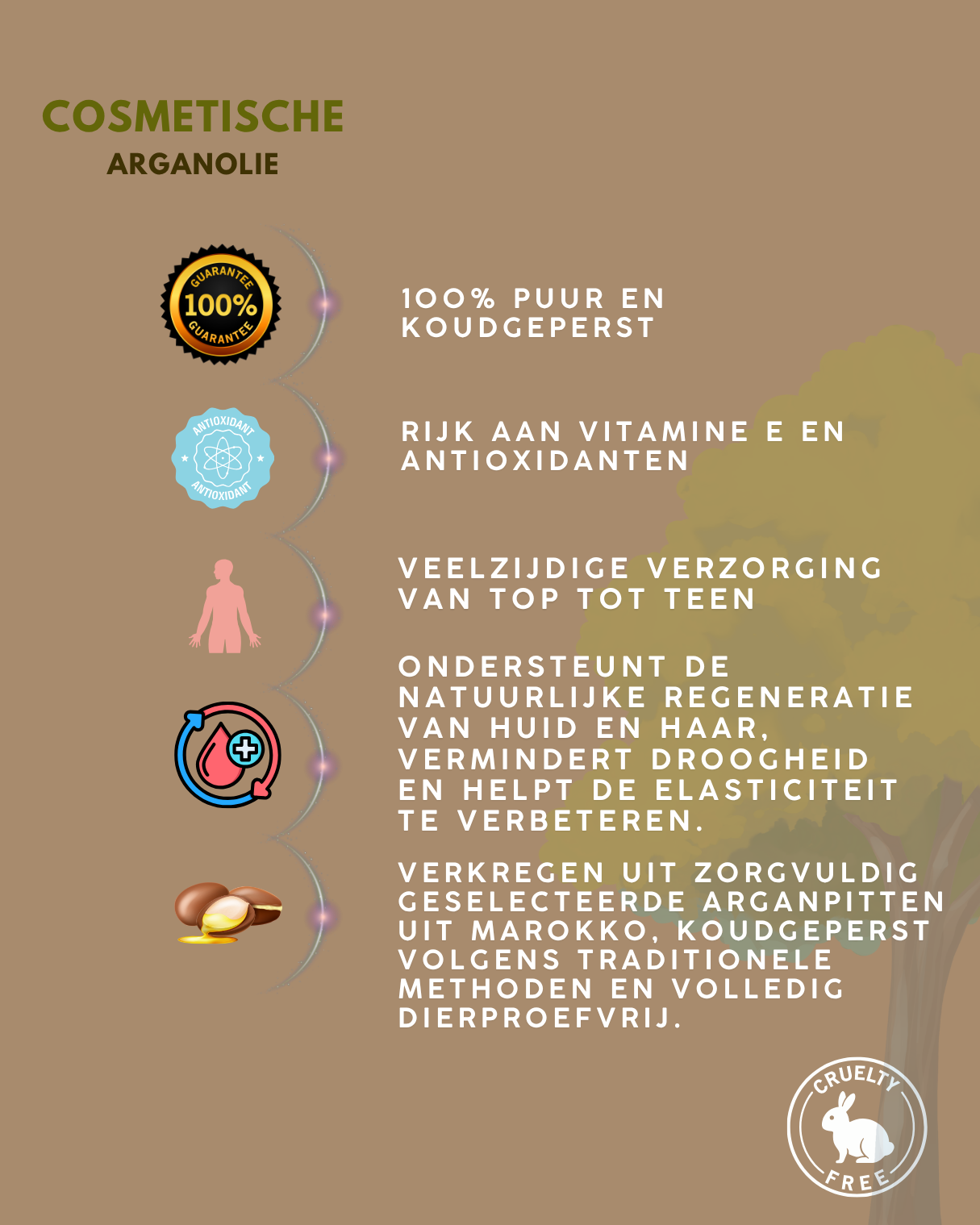 - Anti-Aging: De krachtige antioxidanten in Arganolie helpen bij het bestrijden van vrije radicalen en vertragen de tekenen van veroudering.