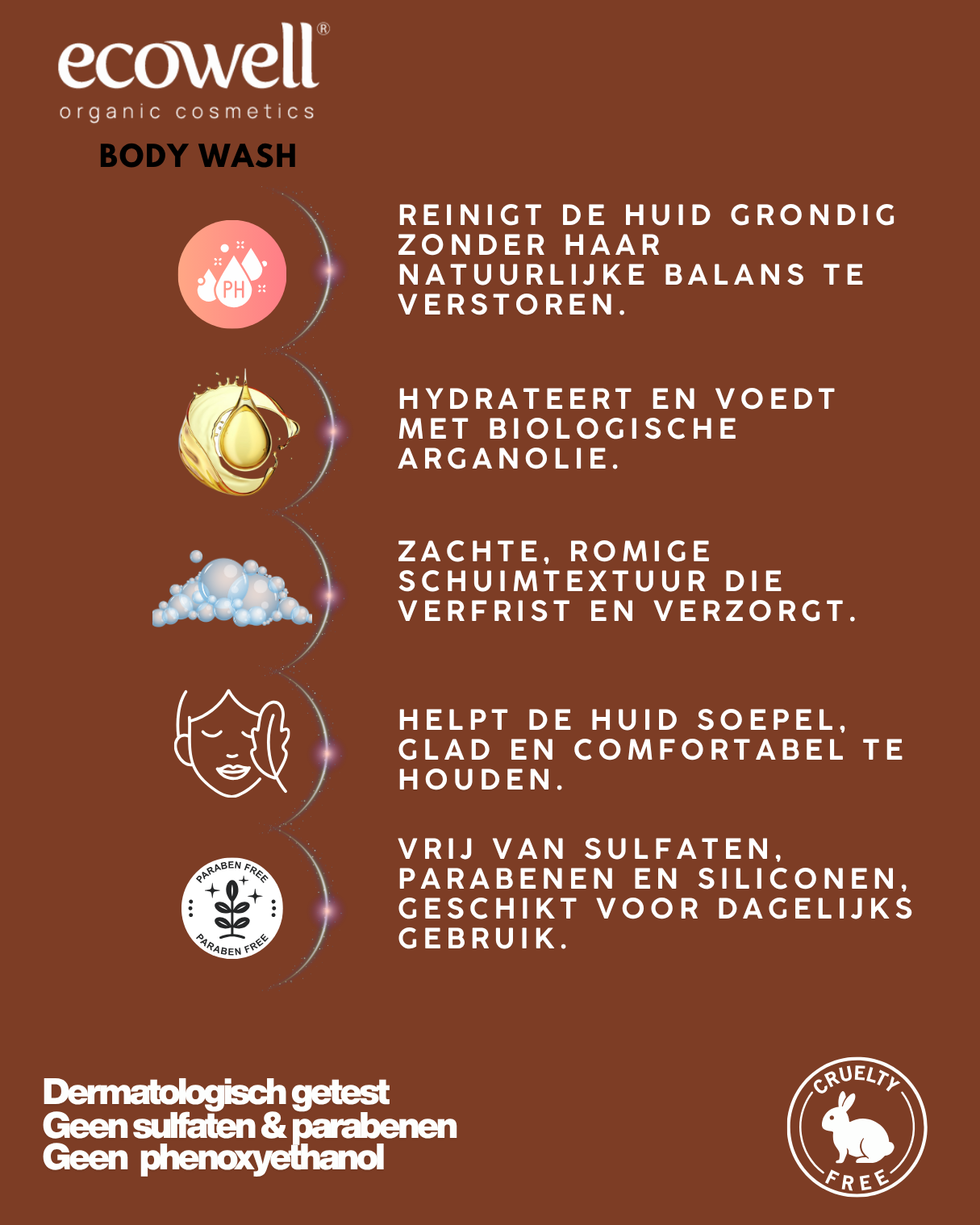 De Ecowell Natuurlijke Douchegel biedt een milde, maar effectieve reiniging van de huid zonder deze uit te drogen. Dankzij de romige en zachte schuimtextuur voelt je huid na elke douchebeurt gehydrateerd, soepel en comfortabel aan. Deze natuurlijke douchegel bevat een hoog gehalte aan natuurlijke arganolie, bekend om zijn voedende, regenererende en antioxiderende eigenschappen.