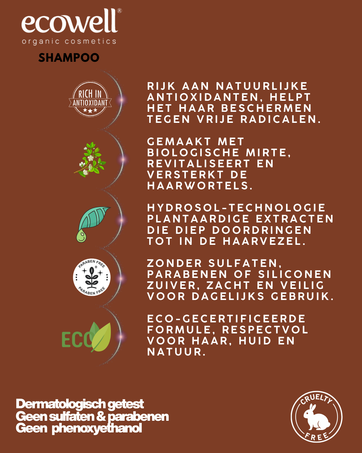 De Ecowell Natuurlijke Shampoo (250 ml) is speciaal ontwikkeld voor mensen die waarde hechten aan een natuurlijke haarverzorging zonder schadelijke toevoegingen. Deze biologische shampoo reinigt het haar op milde wijze en helpt tegelijkertijd om de natuurlijke glans en gezondheid van je haar te behouden. De rijke samenstelling met myrtewater – een krachtige natuurlijke antioxidant – beschermt je haar tegen vrije radicalen en invloeden van buitenaf zoals vervuiling en zonlicht.