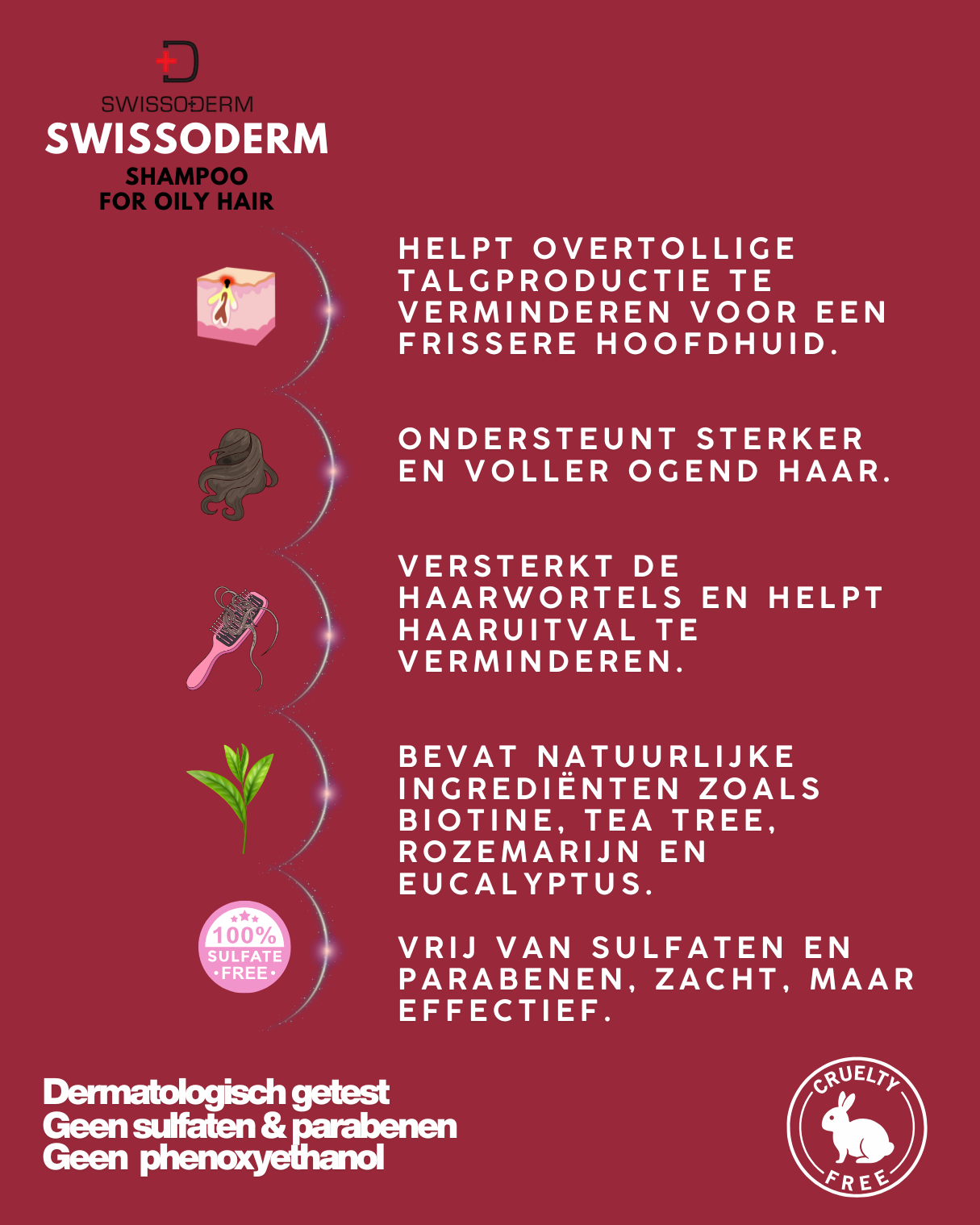 De Swissoderm Anti-Haaruitval Shampoo voor vet haar is een innovatieve formule die haaruitval actief helpt verminderen terwijl het de hoofdhuid grondig reinigt en in balans brengt. Speciaal ontwikkeld voor mensen met een vette hoofdhuid, combineert deze shampoo een uitzonderlijke mix van natuurlijke extracten, vitaminen en etherische oliën die synergetisch werken voor gezond en sterk haar.