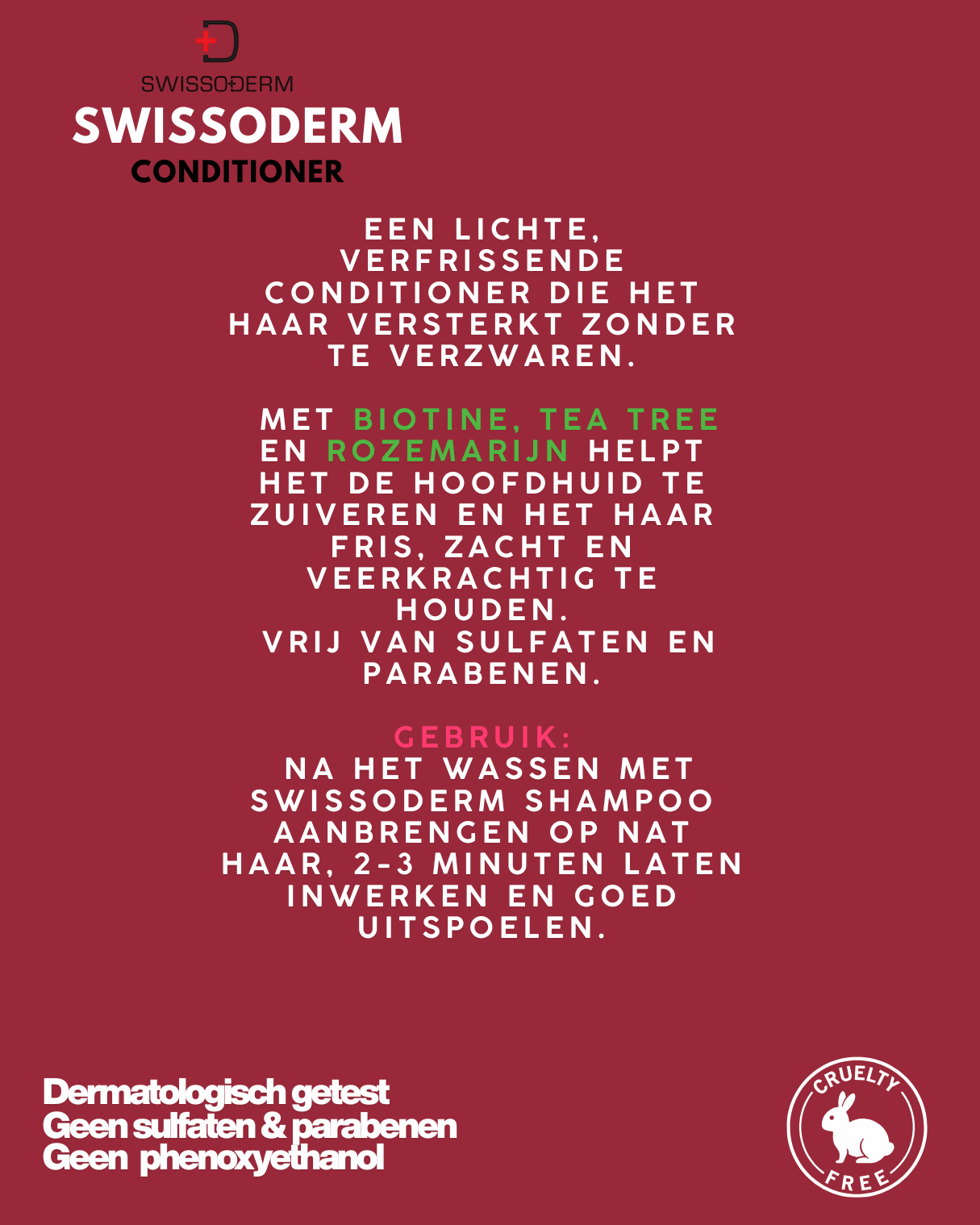 Swissoderm kiest bewust voor een natuurlijke aanpak: deze conditioner is vrij van siliconen, parabenen, minerale oliën en synthetische parfums. De verzorgende ingrediënten zijn geschikt voor elk haartype, maar met name voor haar dat door hitte, verven of omgevingsfactoren is verzwakt.
