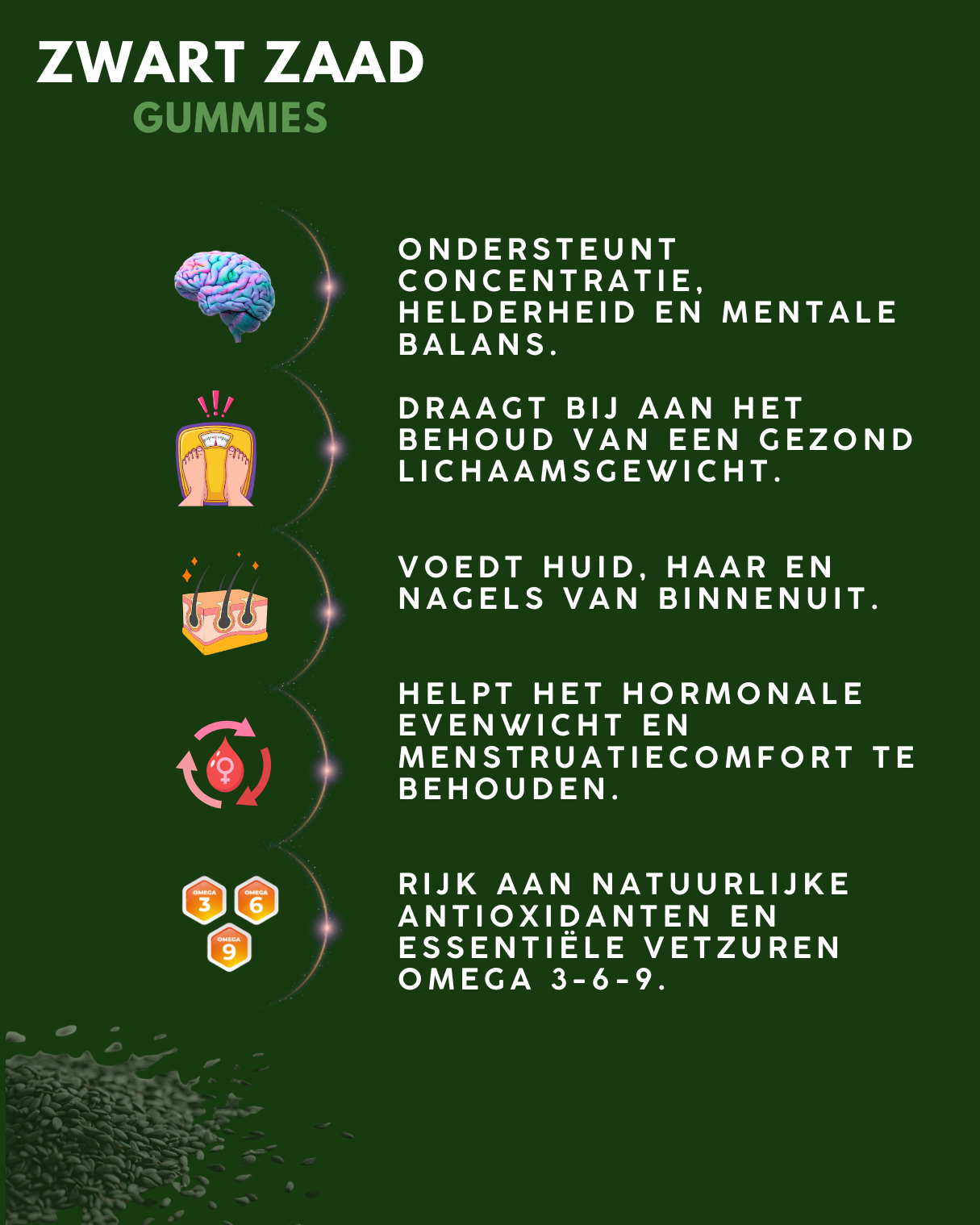 Zwarte zaadolie, gewonnen uit de Nigella Sativa-plant, staat bekend om zijn krachtige antioxidante en ontstekingsremmende eigenschappen. Het ondersteunt het immuunsysteem, bevordert een gezonde spijsvertering en draagt bij aan een gezonde huid en haar. Daarnaast helpt zwarte zaadolie bij het reguleren van de bloedsuikerspiegel en bloeddruk en kan het gewichtsverlies ondersteunen door de stofwisseling te verbeteren. Deze olie is rijk aan essentiële vetzuren zoals omega-3 en omega-6, die belangrijk zijn voor een optimale gezondheid.